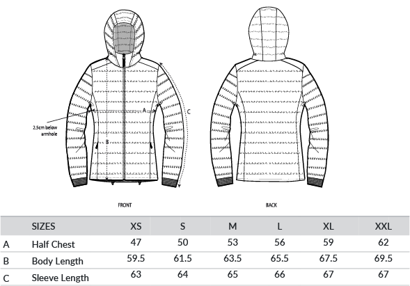 High collar with detachable hood, including metal matte hidden snaps. Hood opening and bottom hem with adjustable plastic stopper and elastic cord. Zipped welt pockets with extra grosgrain pull. Fully quilted. 1x1 rib at sleeve hem. Oeko-Tex certified. Vegan certified. Fairwear Foundation certified.